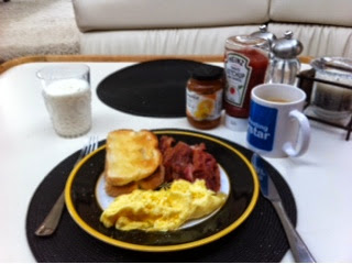 Cooking on a boat has it’s challenges. Yes, it’s an electric stove with an oven. Very nice. But it doesn’t always sit level. Consequently, if you are really fond of eggs over easy, you could be a bit disappointed. The eggs tend to bunch up on one side of the pan. And because the surface area of the stove is a lot less than regular stoves, you need smaller pans. I find scrambled eggs work better.