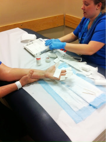 We got to bed about 4am and returned to Barrie this morning. Jane says it feels not too bad, but if she moves around, her hand begins to throb. Right now she is resting in bed and will probably fall asleep soon.