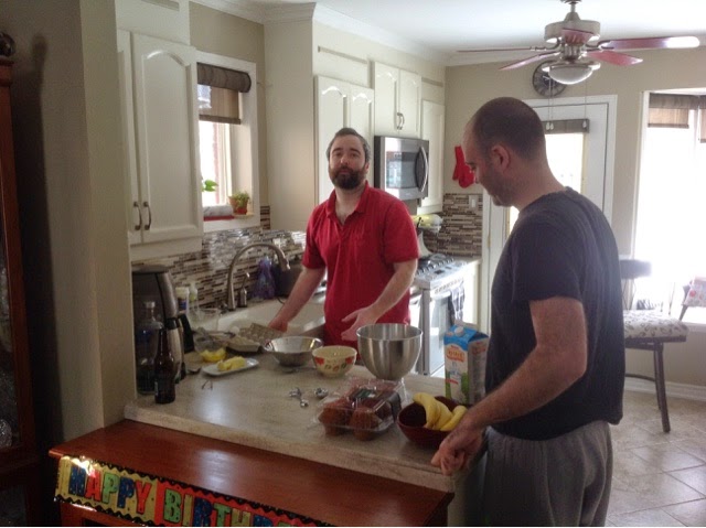 Yesterday, we celebrated MY Jane’s birthday even though it’s not really until next Tuesday. It began with Steven and Chris making her choice for breakfast which consisted of waffles, bacon and fruit. Here the guys are hard at it.