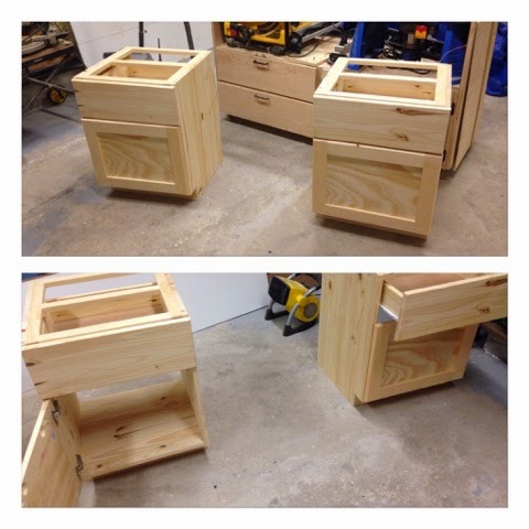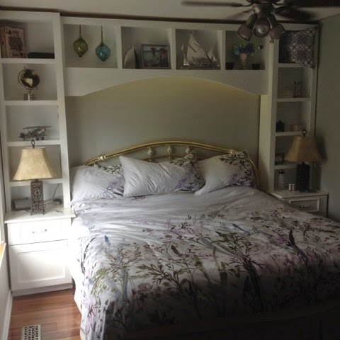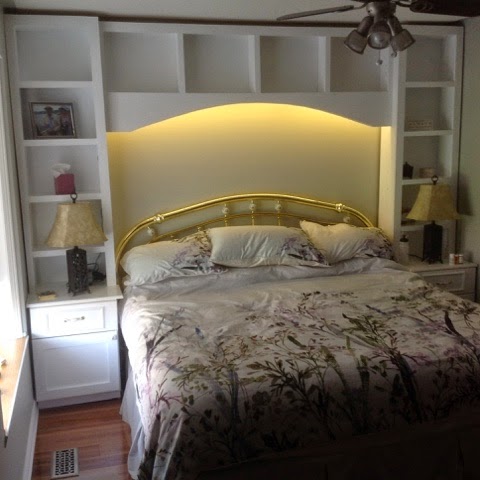 Yesterday, before MY Jane left for Toronto to meet up with Chris and Steven, she put the second coat of paint on the middle section of our headboard/night table project and then the two of us attached it to the two towers which were already in place.
