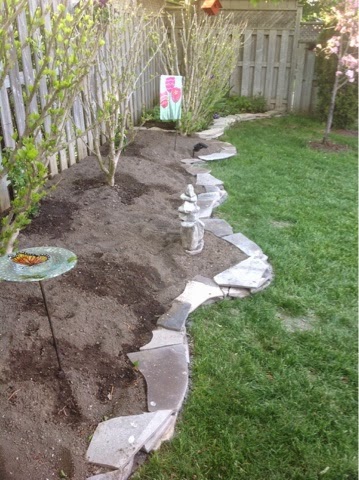 Yesterday, while MY Jane took Ted to an appointment and I drove Terry and Dan to the airport, the landscaper finished the back garden flower bed and added topsoil to both flower beds.