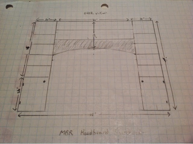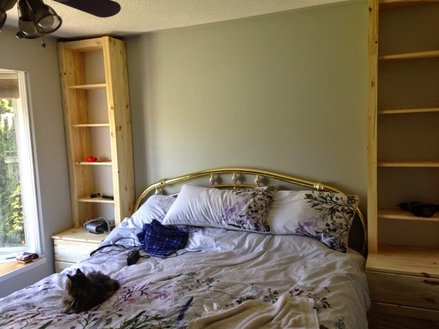 Yesterday, before MY Jane left for Toronto to meet up with Chris and Steven, she put the second coat of paint on the middle section of our headboard/night table project and then the two of us attached it to the two towers which were already in place.