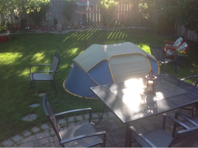 Despite the rain check on the island camping idea, both guys were determined to sleep in Steves tent, so they set it up in our back yard. It’s one of those tents you throw up in the air and it comes down all opened up and ready to peg down. Impressive. We got it for Steve last Christmas.