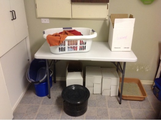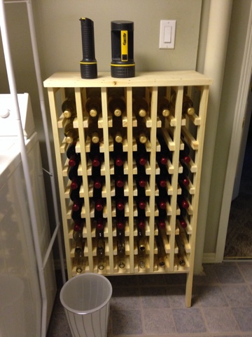 Some months ago, Jane and I went to Vin Bon and made a couple of batches of wine – 26 bottles of white and 26 bottles of red. After we got the 4 boxes of wine home, the only spot we could find to keep them was under the folding table in the laundry room.