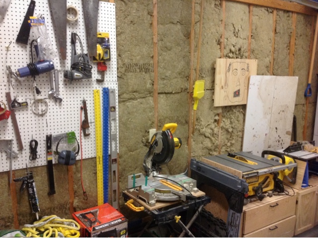 Yesterday, with Jane’s help, I did more insulating of the garage. We took the peg board down leaving all the tools in place, and after putting up the insulation, they were re-installed.