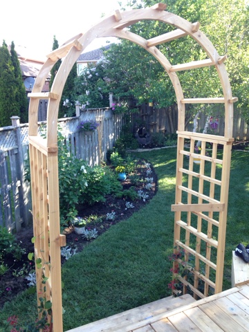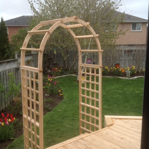 In yesterday’s blog, I mentioned that the deck is finished. Not so fast! I forgot that MY Jane had alluded to having an arbour over the steps. So, this morning, I checked out the Internet for some arbour examples. I was primarily interested in designs, but was astonished to learn that they sell these things anywhere from a few hundred dollars to $1129!