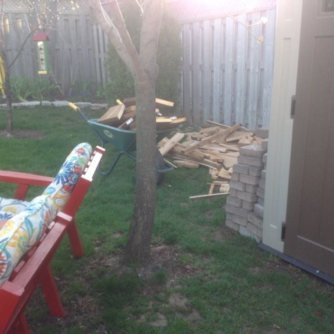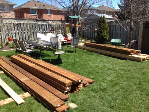 Yesterday, Lowes delivered our deck. Well, not exactly. They dropped off all the material in our driveway is a more accurate statement. With the help of MY Jane, and Allan, our across the street neighbour, we moved all of it to the back yard, which now looks like a construction zone.