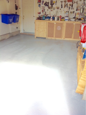Today, I decided I would tidy up the garage a bit. I noticed there were some stains on the floor so I tried scrubbing them off with Mr. Clean and a brush. They didn’t really come out as well as I wanted and the floor was now missing paint in some spots.