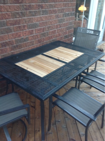 I had an interesting start to the day. I decided to put the patio furniture back on the deck this morning starting with the table. I forgot that two large tiles in the centre were in there loosely. They were not fastened in place.