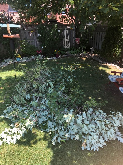 Our trees in the back yard were in serious need of attention. The birch had all kinds of dead limbs and the big maple was overshadowing the back corner.