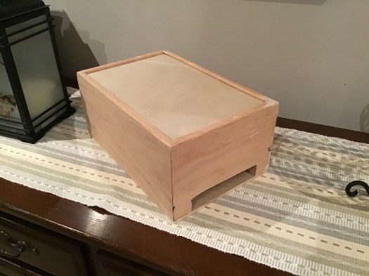 The opening at one end, which you can see below, is to accommodate the secret compartment access and tomorrow, once everything is dry, I will cut the lid and then work on the secret part of it.  I am thoroughly enjoying this project for our granddaughter; we both have visions of her keeping little treasures in this compartment.   Her father is sentimental in that way, too.
