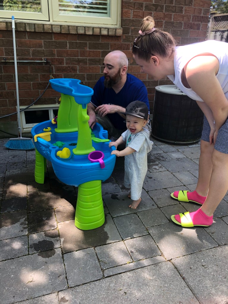 Chris had assembled the Rain Showers Splash Pond that we had purchased for Max’s birthday and it was a lot of fun watching him play with it for the first time. Clearly he enjoyed it. See him on his tippy toes!! He was looking so grown up with his hat!