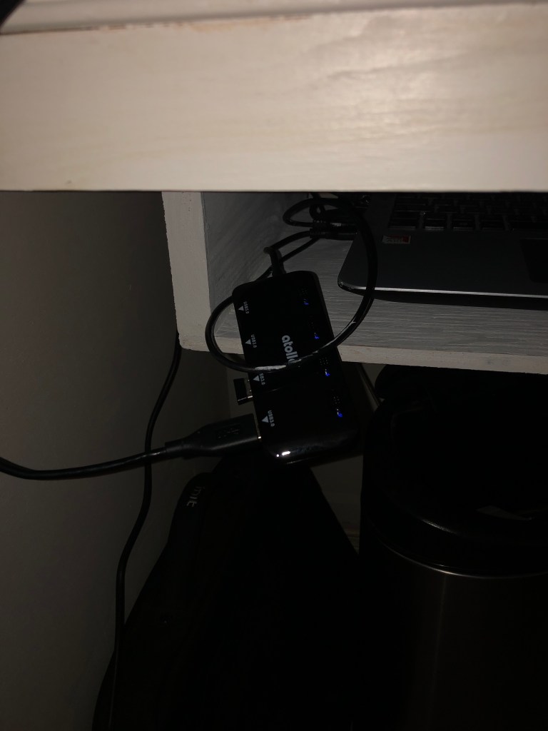 I installed a small shelf under the desk surface to hold the laptop, freeing up quite a bit of room on top!
