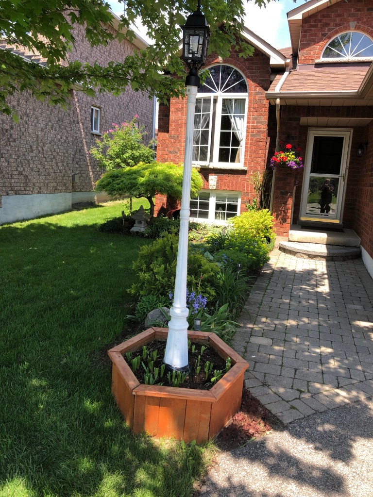 Jane even touched up the lamppost planter with some fresh stain in their honour! When we get a calm day, we’ll paint the post black.