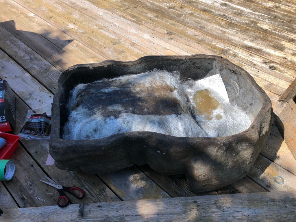 Well the saga of the waterfall continues; the flex seal repair I tried didn’t stop the leak, so I now have a fibreglass repair kit which I’m using on the underside of the basin.