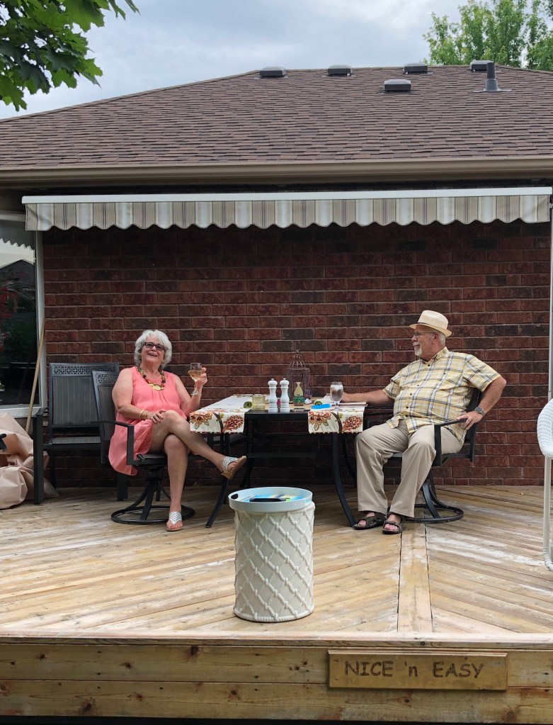 Our plan was to order a high end dinner to take out and dine near the water, but the weather forecast didn’t look promising so we ate on our garden deck.