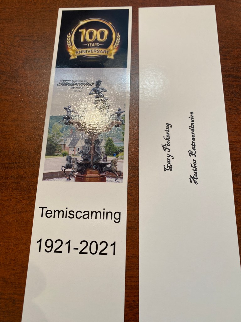 And I continue doing work on the Temiscaming book project. Today I sent a little sales kit up to Dean Sparling in Temiscaming, the kit contains bookmarks for the authors to receive at time of purchase as well as a display stand and two proof copies of the book to use promotionally.