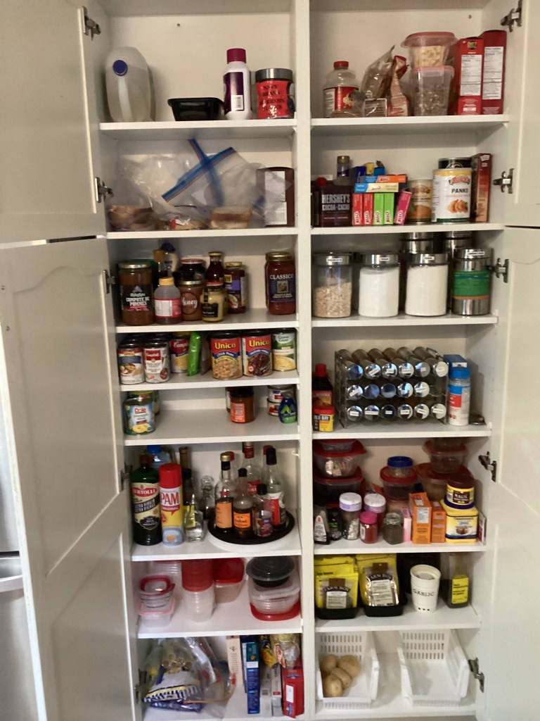 Today we decided to re-organize our kitchen pantry in preparation for the new cupboard doors coming next week. We took everything out and placed everything on the dining room table.