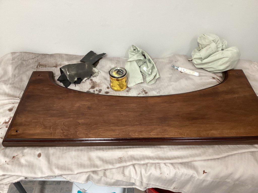 Jane had noticed some water damage on the bottom of the little marble topped table in our dining room; she was dismayed that the brass swans were damp when she last cleaned them. She undertook to sand it down and refinish it.