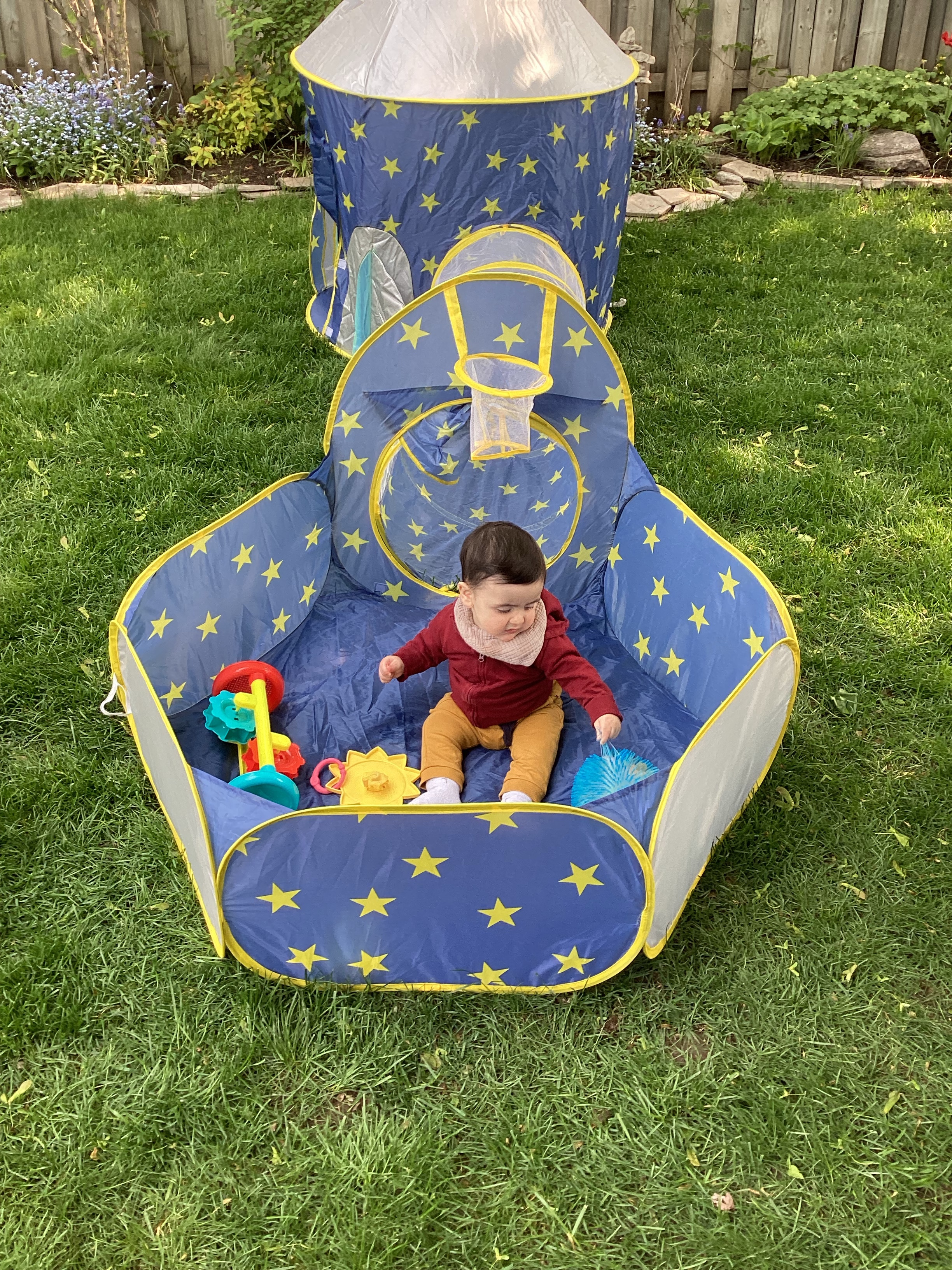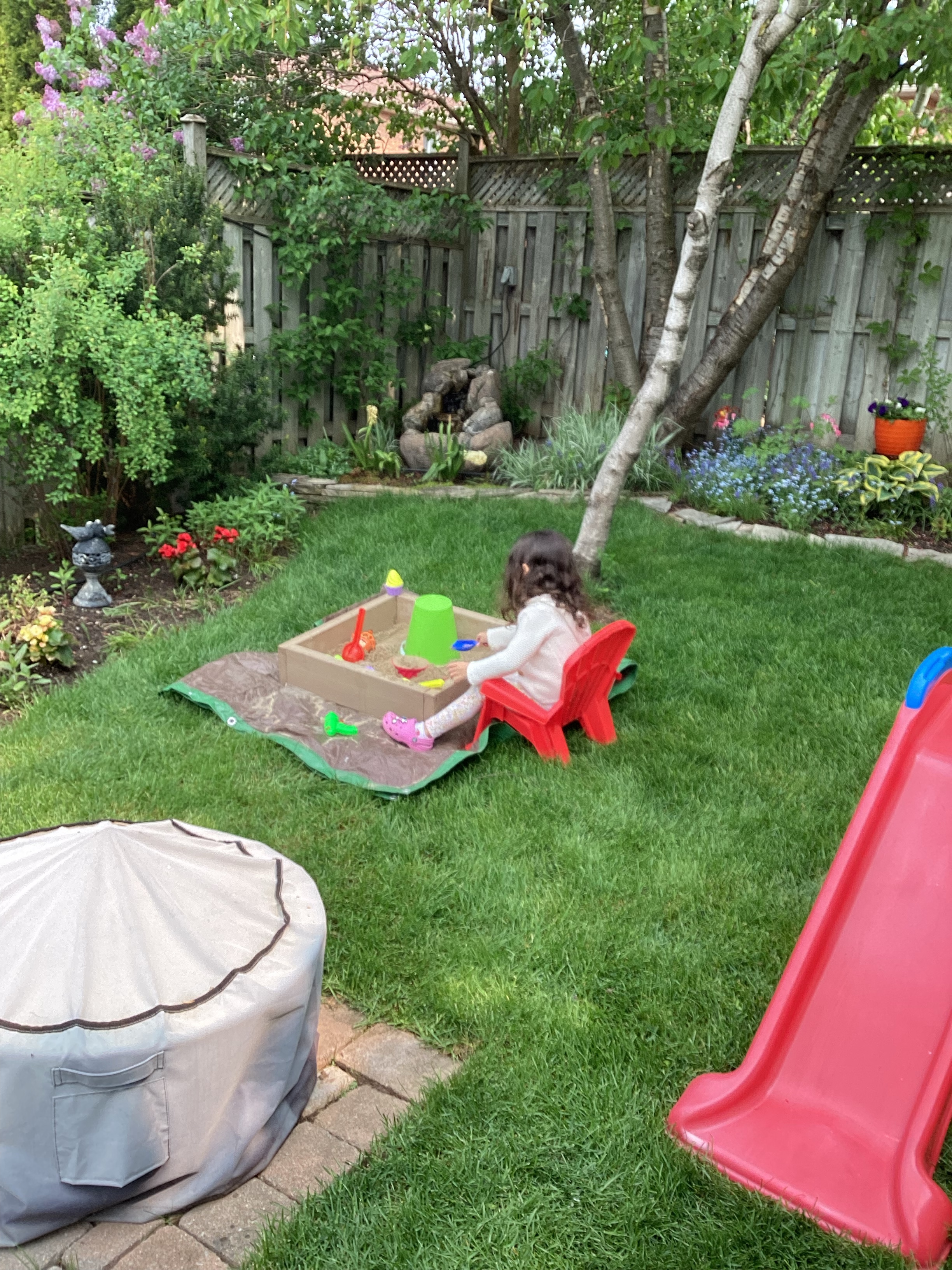 After breakfast, I set up the sandbox and tent in the back yard to make a little playground in which Roxana played T Ball, blew bubbles and slid down the slide.