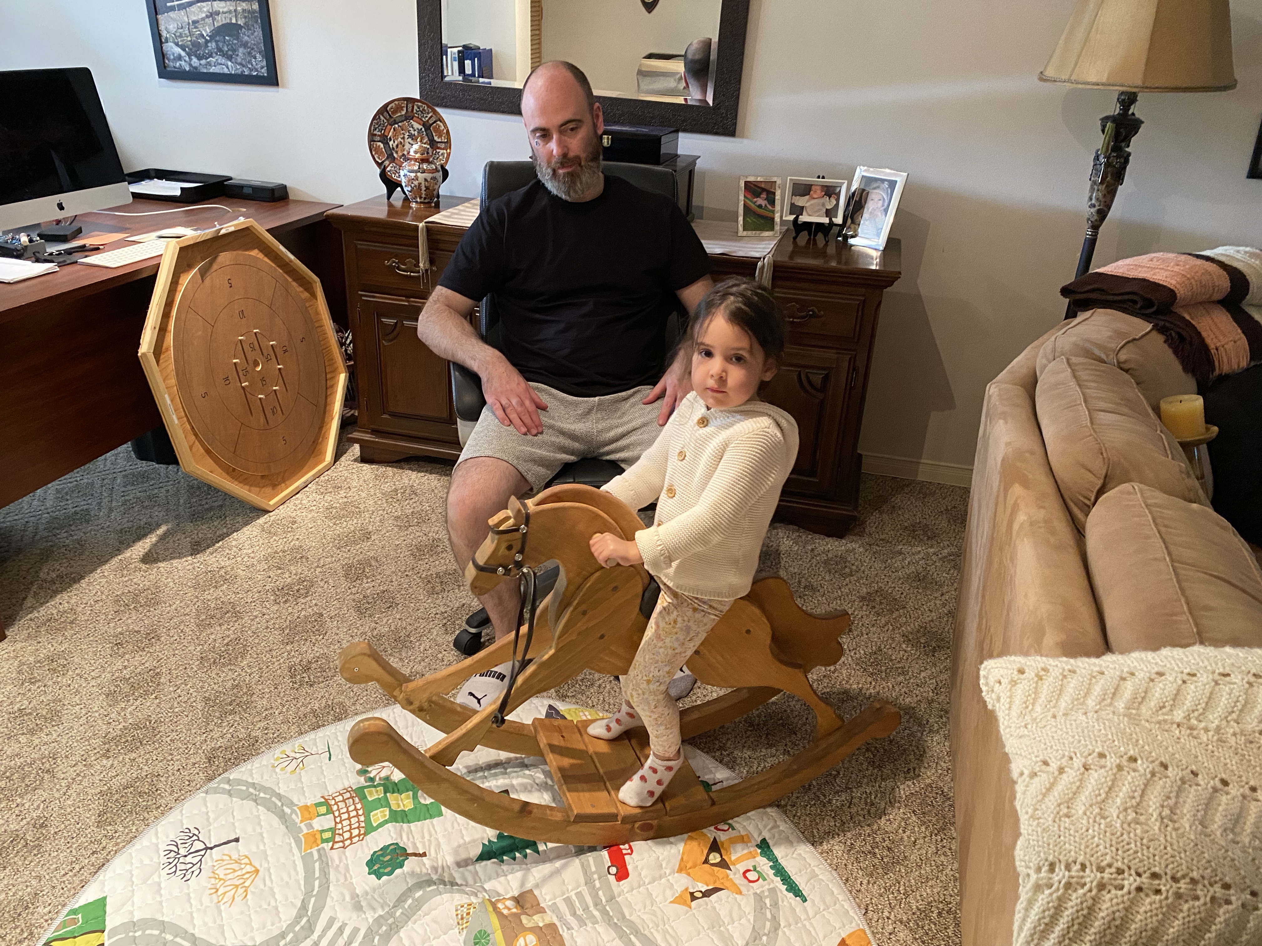 Then Roxana rode on Pal, the rocking horse I made a few years ago and then we played some crokinole.