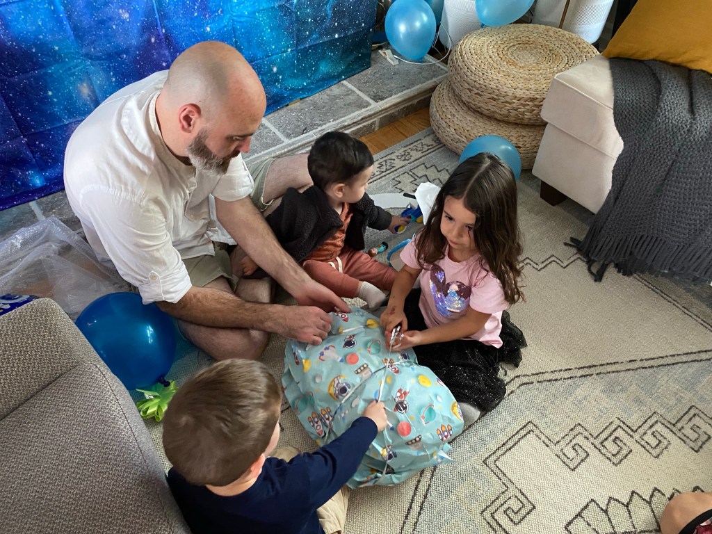 After the cake and a rousing rendition of Happy Birthday, he began opening gifts, a new experience for him. But he had his sister and cousin to help and they were eager to show him the ropes.