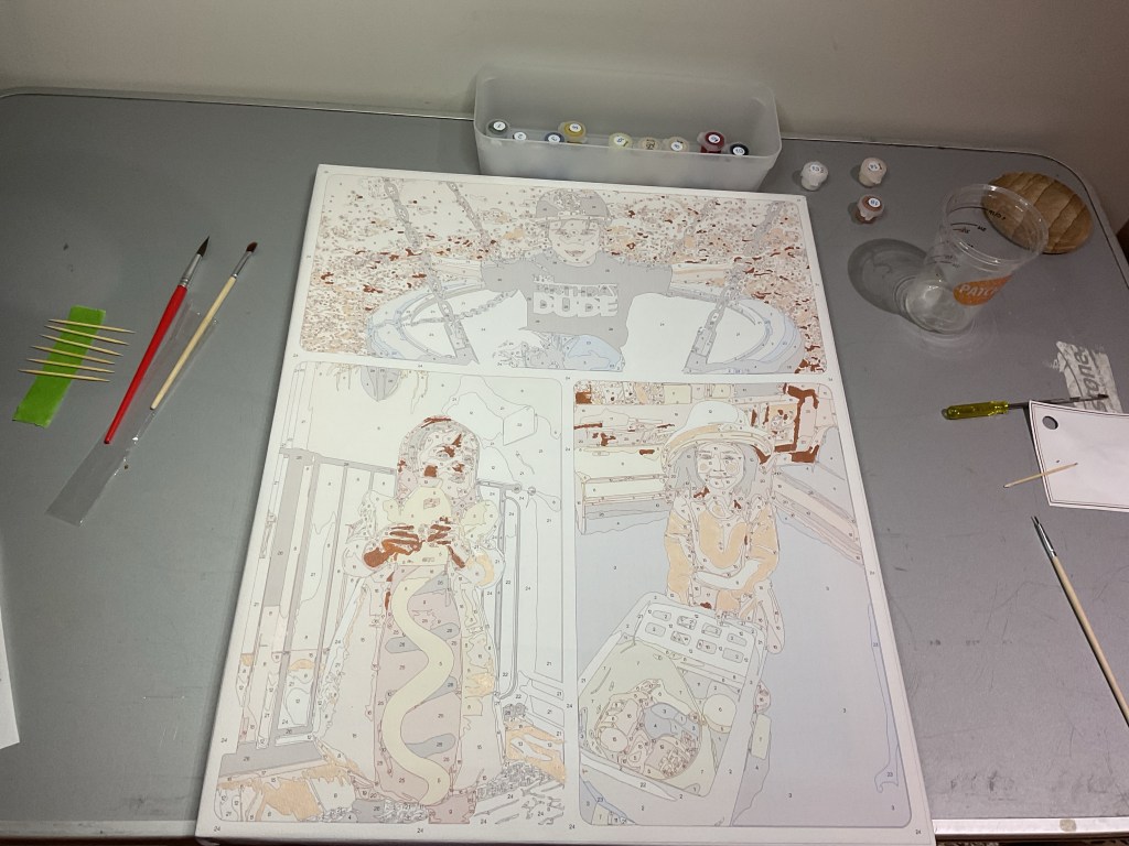 After viewing a couple of YouTube videos with tips on how to Paint by Number, yesterday we began our project. They suggested doing the smaller spaces first and starting top left if right handed so as not smear anything. Jane and I are taking turns and this is what we have got done so far.