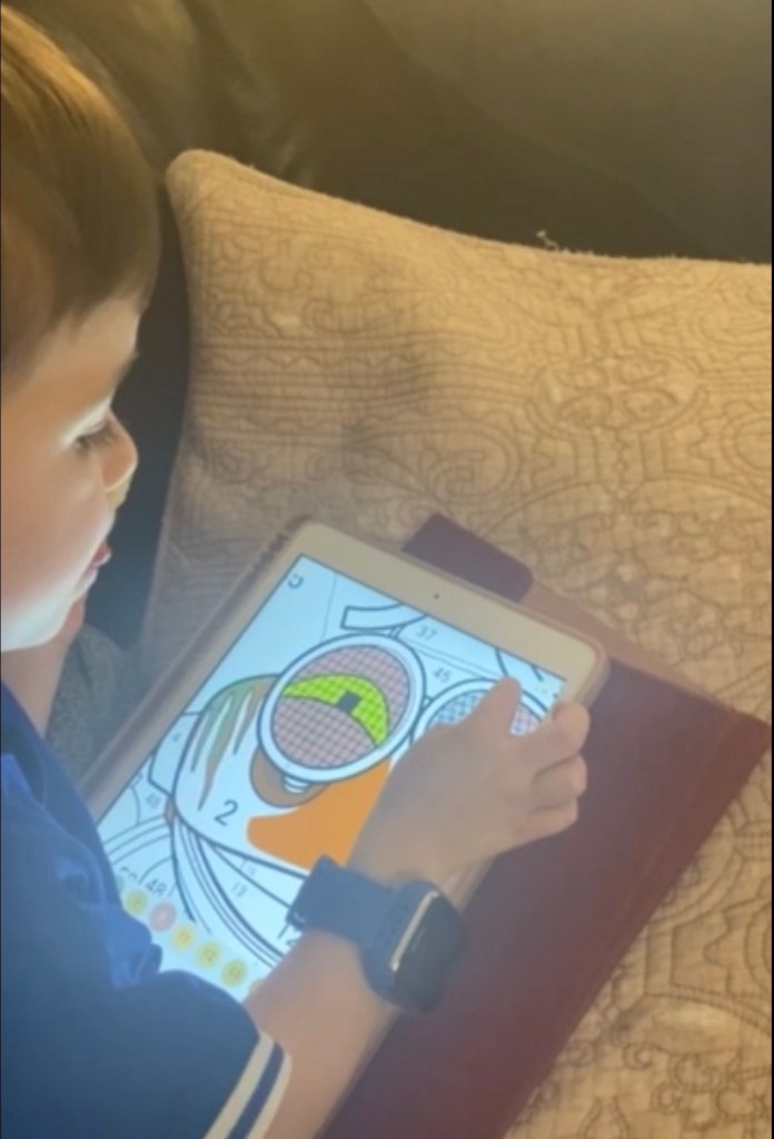 Jane showed Max how to do colouring on her I Pad and he was hooked.