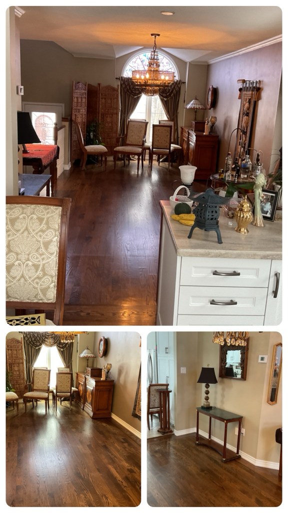 Jane has already cleaned the rest of the hardwood on the main floor with Murphys Oil Soap, so today we moved the dining room table and chairs out of the way so she could do the area that’s covered by the rug.
