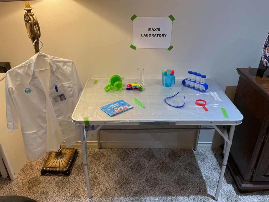 I set up a laboratory arrangement for him, complete with lab coat and kids science kit along with some experiments that he can do.