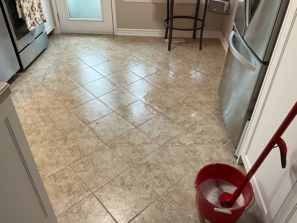 Needless to say that very corrosive cleaner overflowed into the kitchen floor and, as a result, a small section of grout got very clean. We had to get the rest of the floor just as clean, hence this job today.
