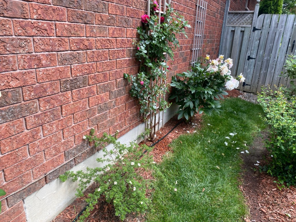 The flowers alongside the garage appear to be lacking water, so I decided to extend the drip irrigation line from the backyard flowerbeds.