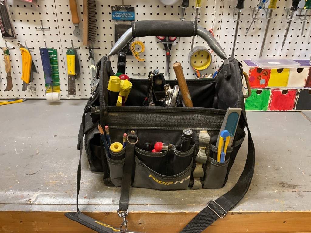 Not only did I straighten up the bench, I also organized my tool pouch so that when I have any kind of home repair, I can simply grab the pouch knowing that anything I might need will be in there.