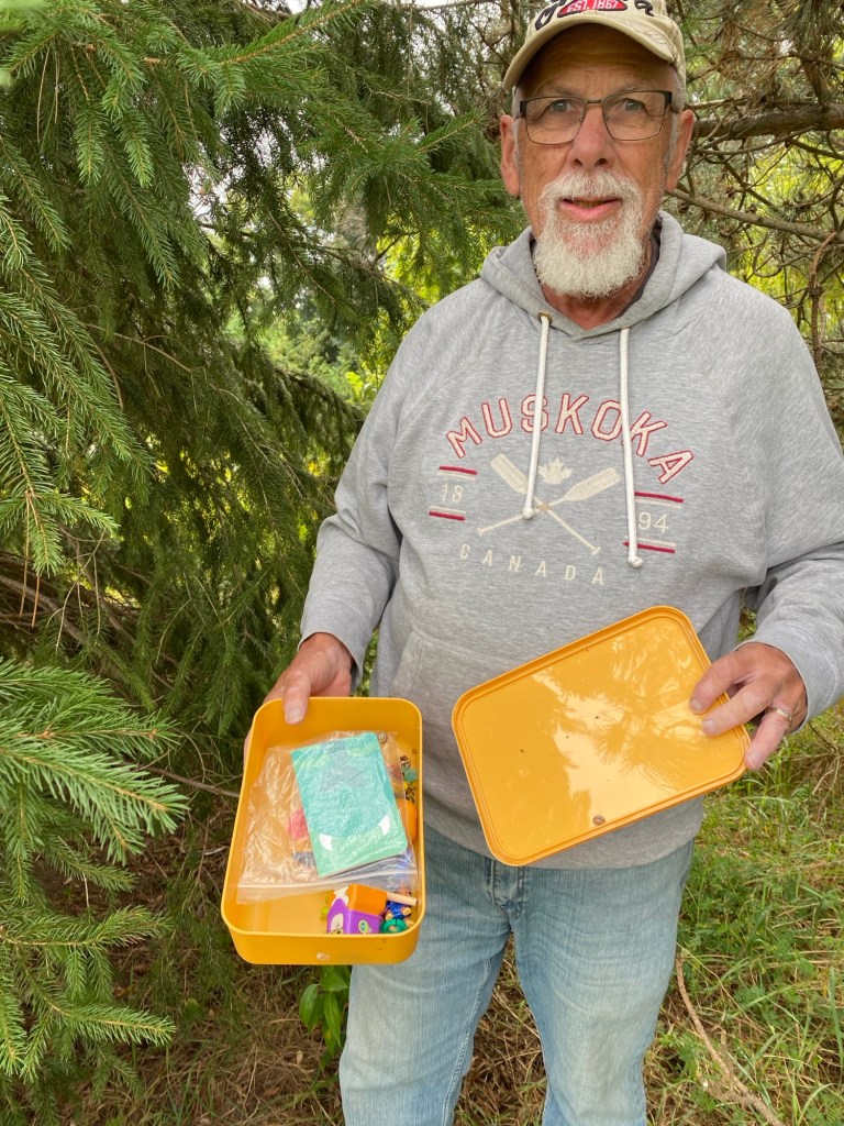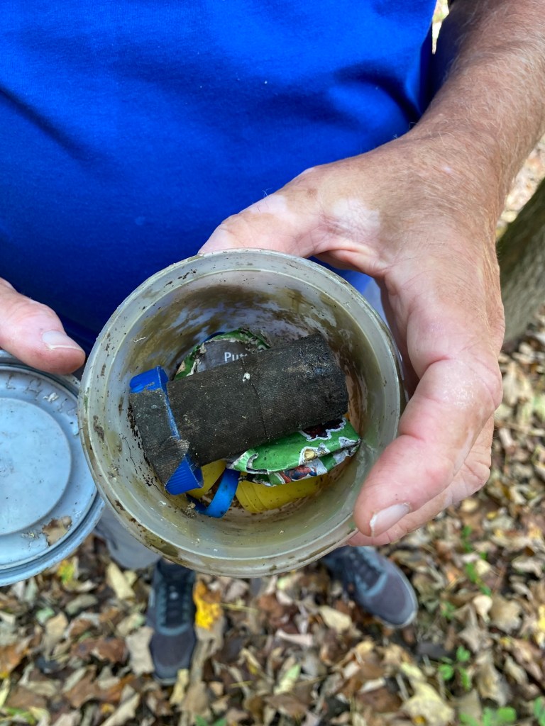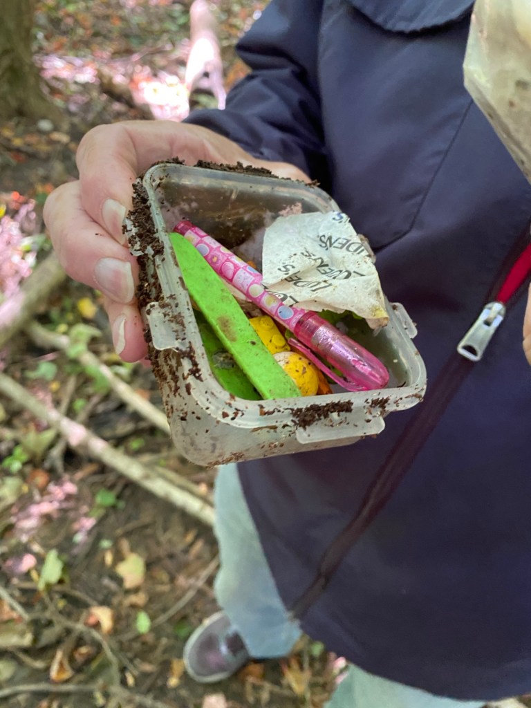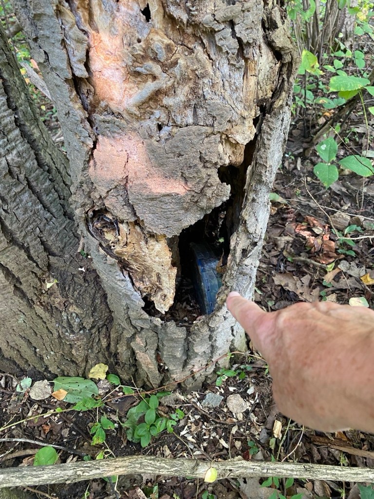 It was inside a hollow tree and the container contained all these trinkets and a soggy log.