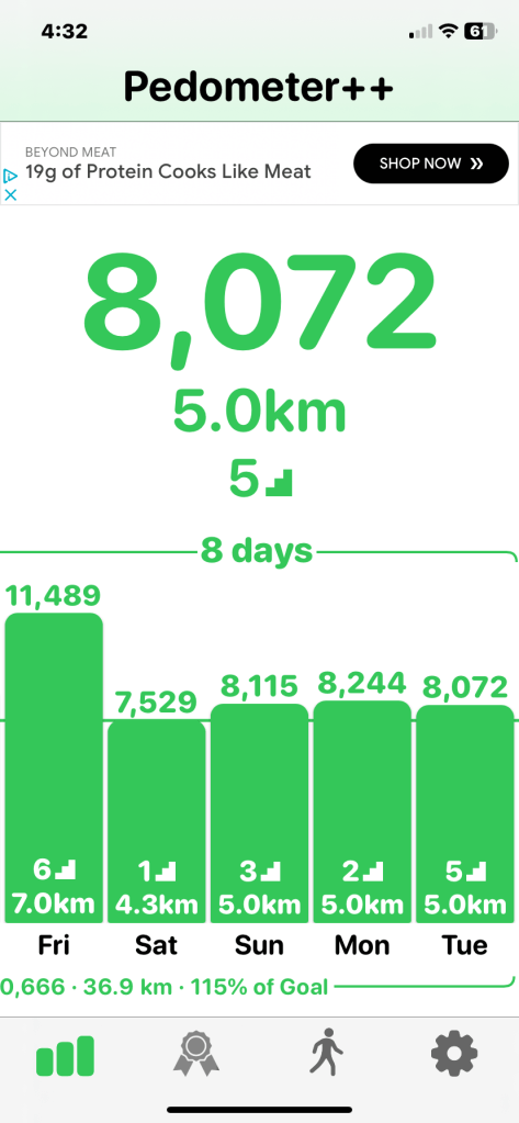 However, since the surgery, I have been slowly gaining that weight back, so a month ago I put myself on a lifestyle that includes the Shouldice diet again, including making the Shouldice soup, and I have begun daily walking using a pedometer to track my progress. I set a goal of 8000 steps a day.