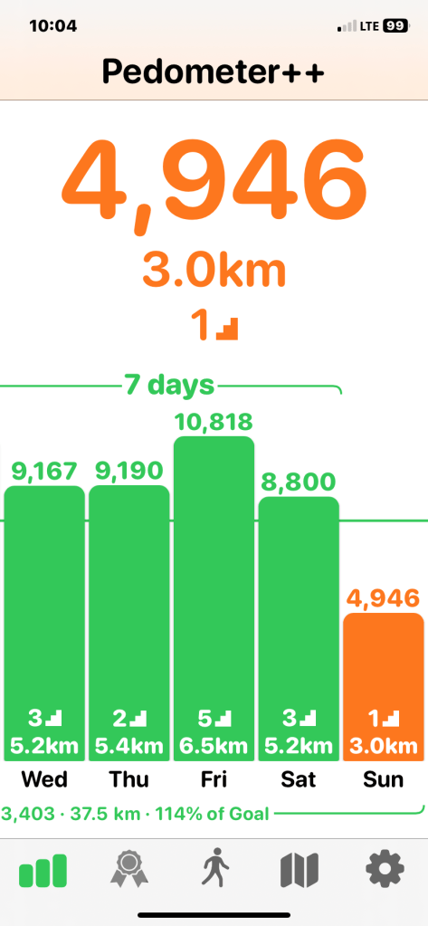 Last week my target for number of steps was 7500 per day, but now I have increased the target to 8000. Chris is also tracking his step count and we compare. Here’s today’s count as of 4pm.