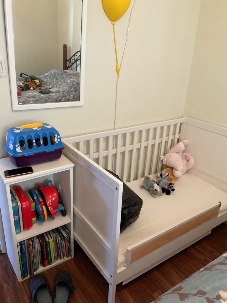 After trying a couple of combinations, we ended up turning the crib around which then created a little more space to move the bed out.