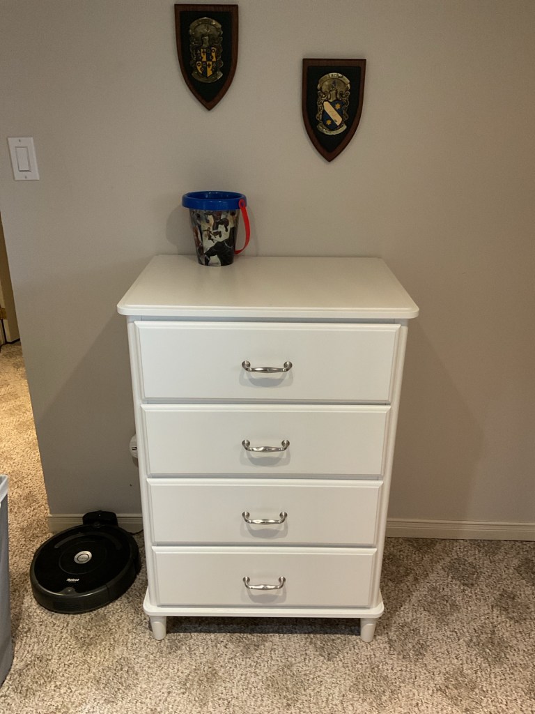 We moved the dresser out of the upstairs guest room down to the family room to make room for the bookshelf.