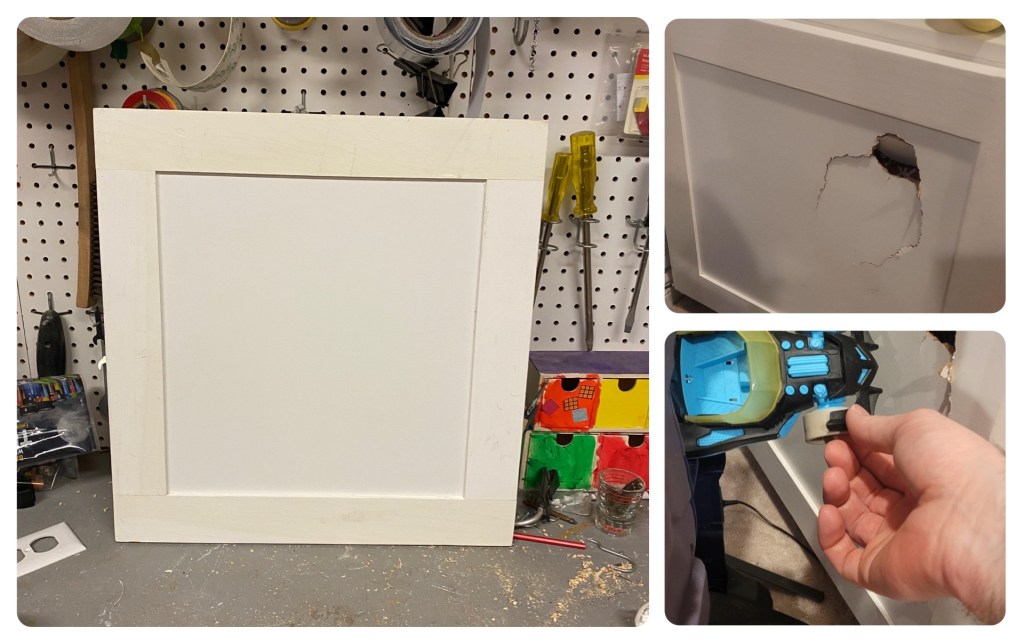 The surround sound cabinet that I made for Chris and Tonya ended up with a major hole in one of the doors as a result of a Batmobile being accidentally impaled in it.