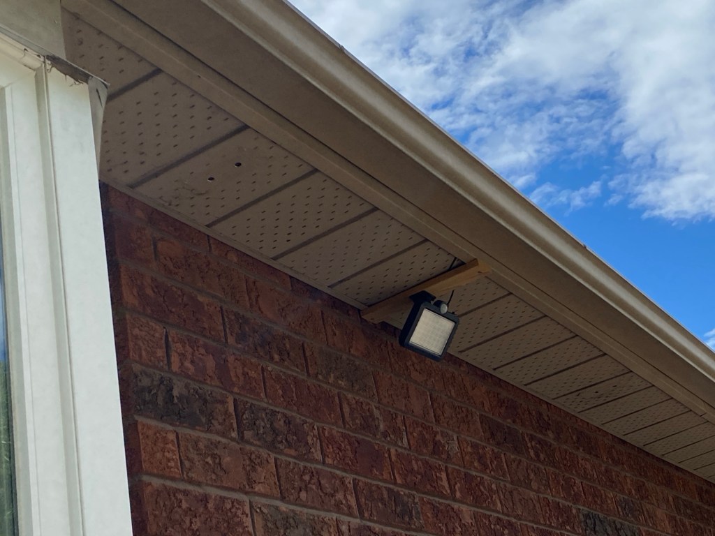 I tucked the wire into the soffit out of sight and mounted the solar panel on the fence post between the houses. I’ll see how it works tonight after dark. It’s got a motion sensor on it.