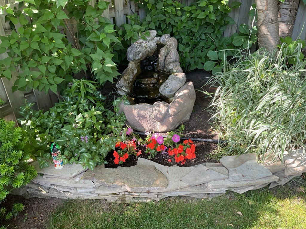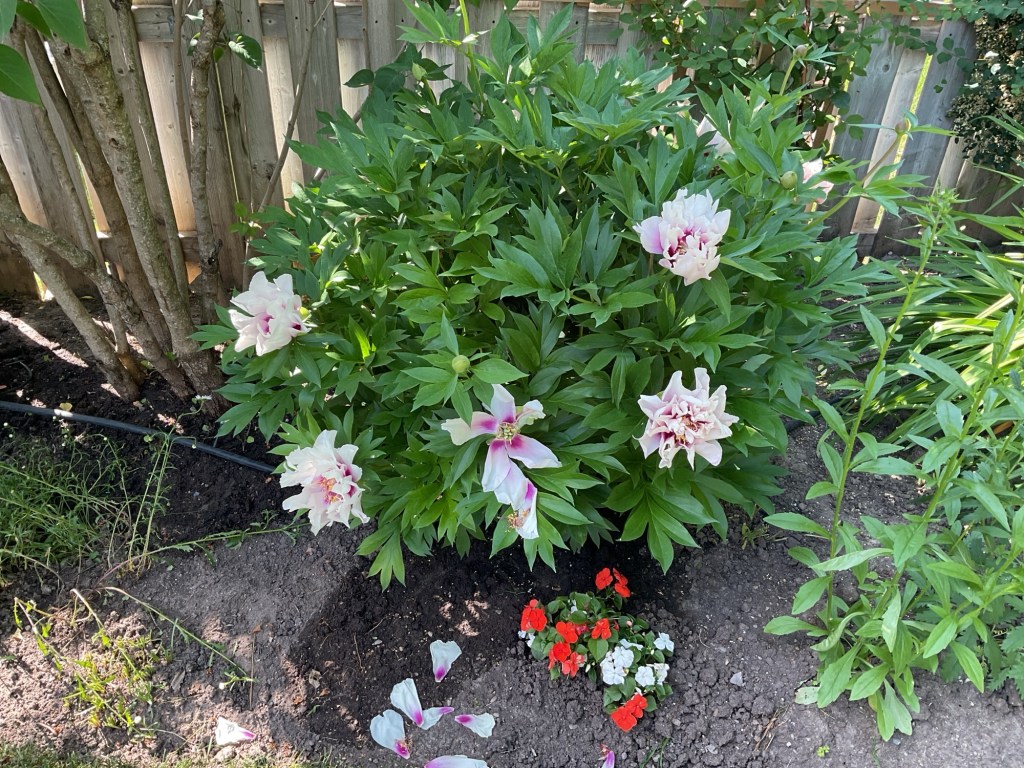 Our back yard is now in its summer phase. The bridal wreath spirea is done and the lilacs are finished. Now it’s the turn of the peonies and echinacea as well as the roses of Sharon bushes.