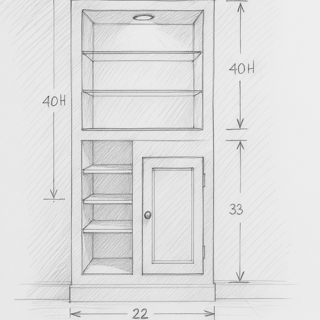 Over top of that cabinet will be an open space with three or four glass shelves and an overhead dimmable pot light.
