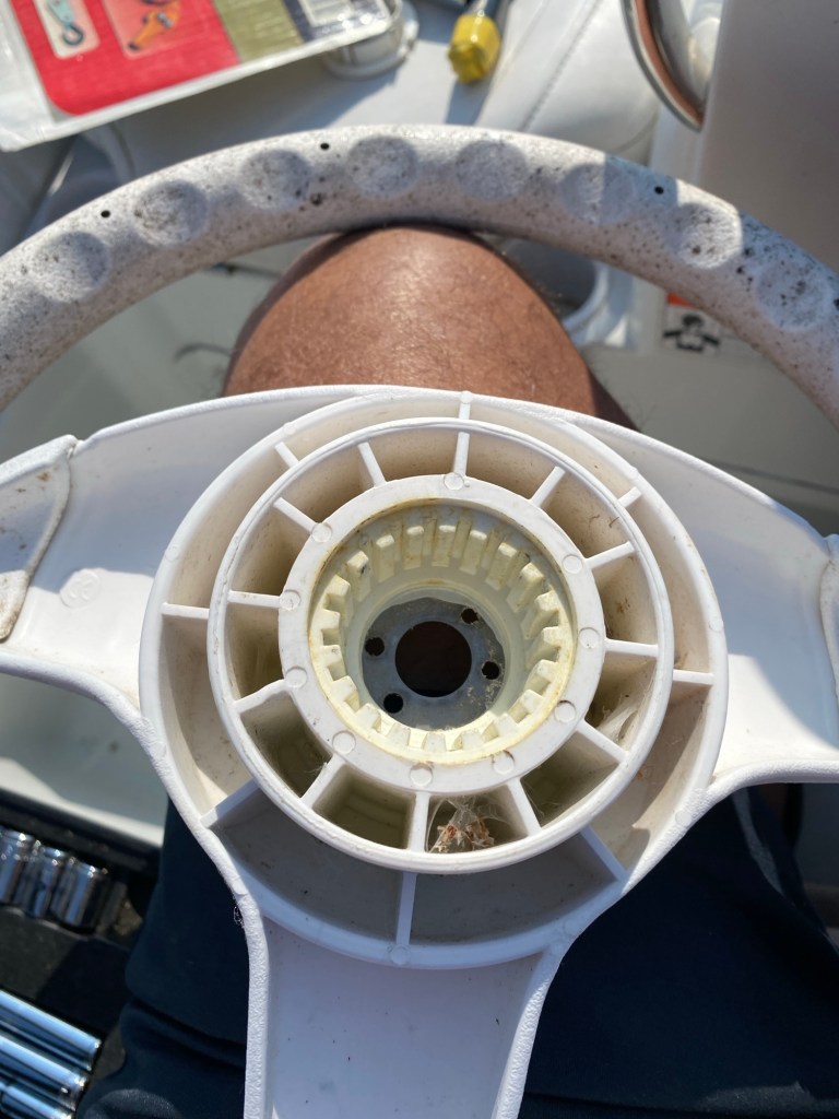 The steering wheel on Shenanigans is in bad shape. It’s supposed to be white in colour, it’s got all kinds of black spots on it, so I ordered a universal fit wheel to replace it.